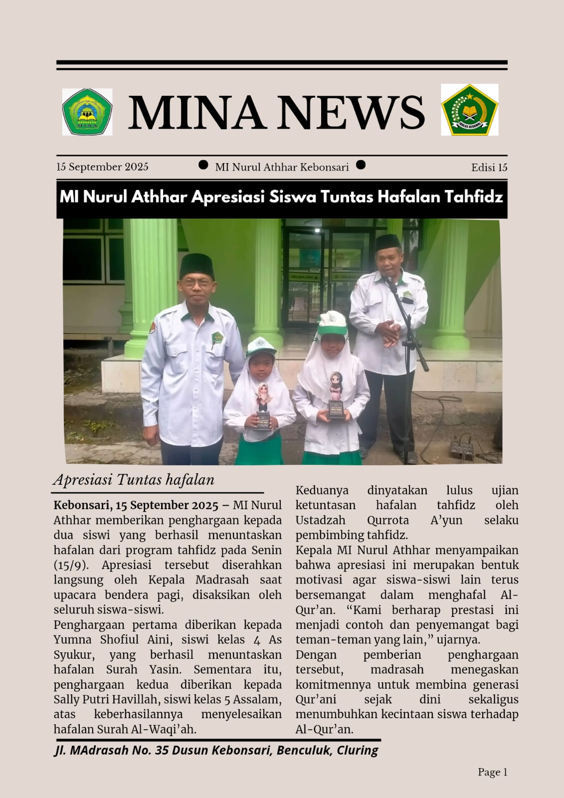 MI Nurul Athhar Apresiasi Siswa Tuntas Hafalan Tahfidz